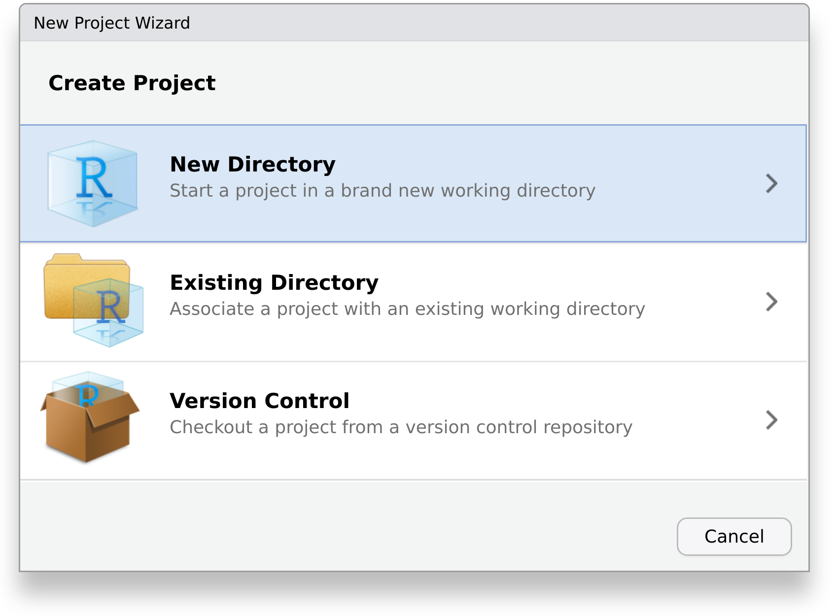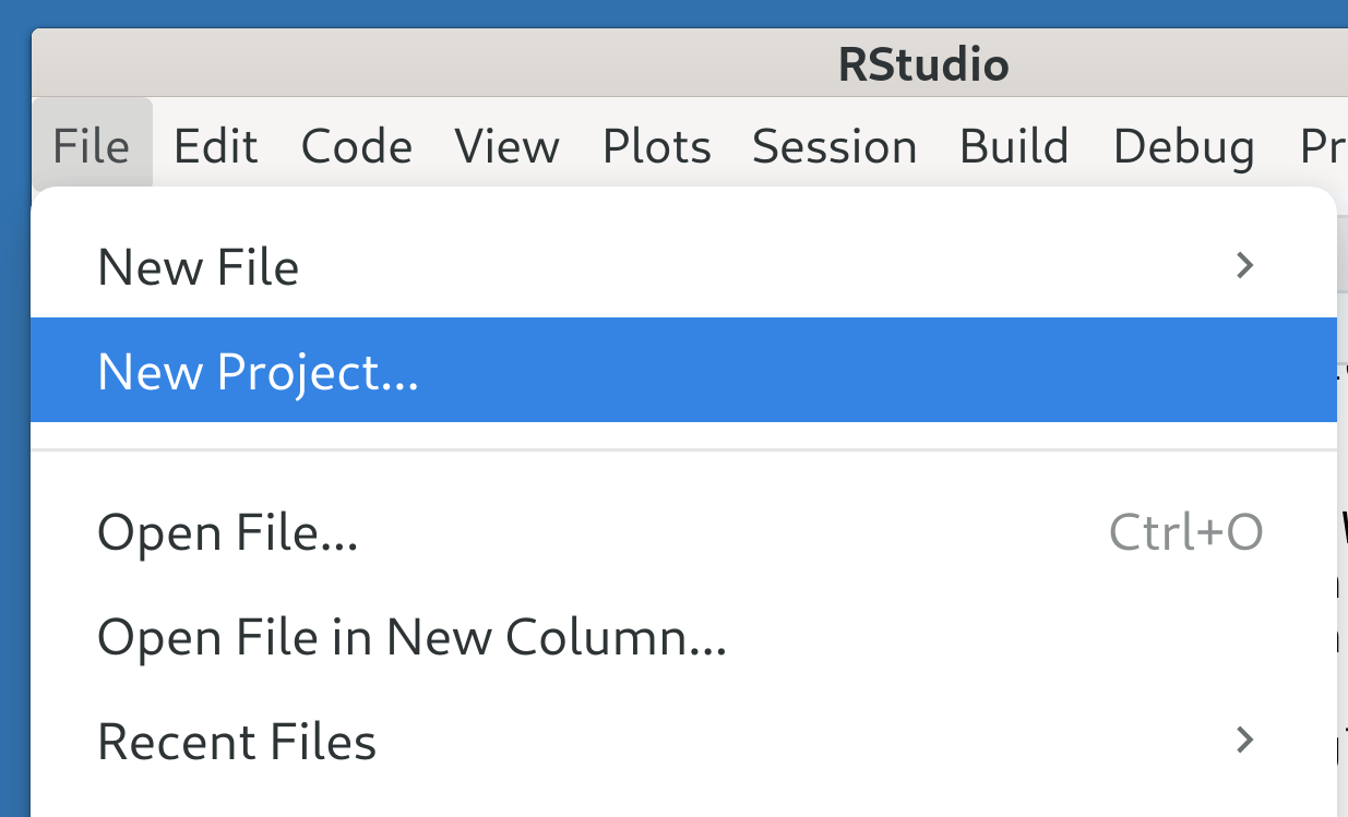 If you haven’t already, open RStudio – see Note 1 for how to use the terminal instead. Then, click on File > New Project… to open the New Project Wizard.