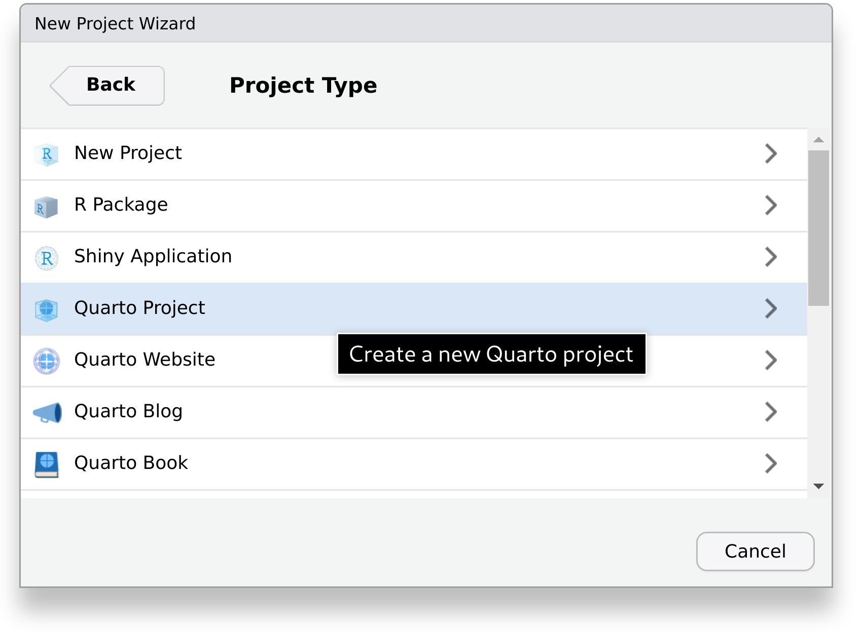 If, like in the image, a Quarto file with some demo content was opened automatically, you can close and delete it, for example, using RStudio’s file manager.
