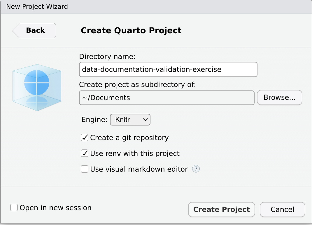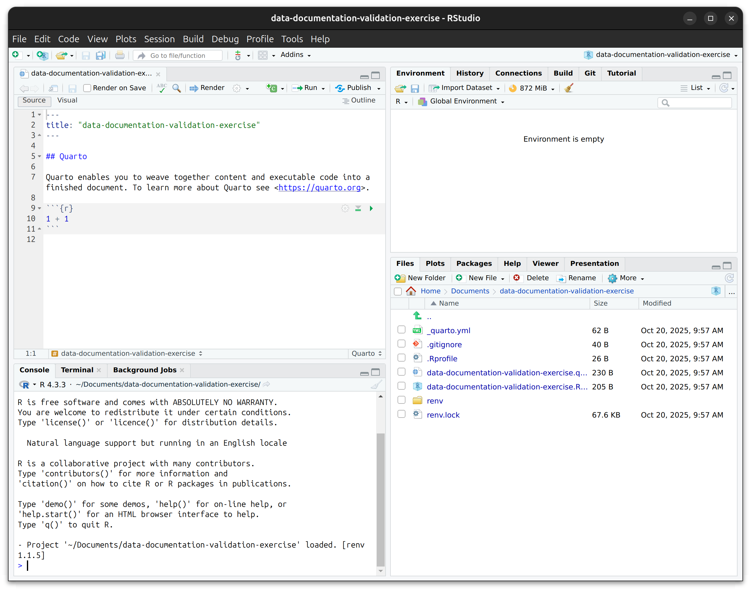This section guides you through setting up your R environment for data documentation and validation. You’ll create a reproducible project structure using Quarto (a tool for creating documents that combine code and text) and renv (a tool for managing R packages) that supports open science practices.