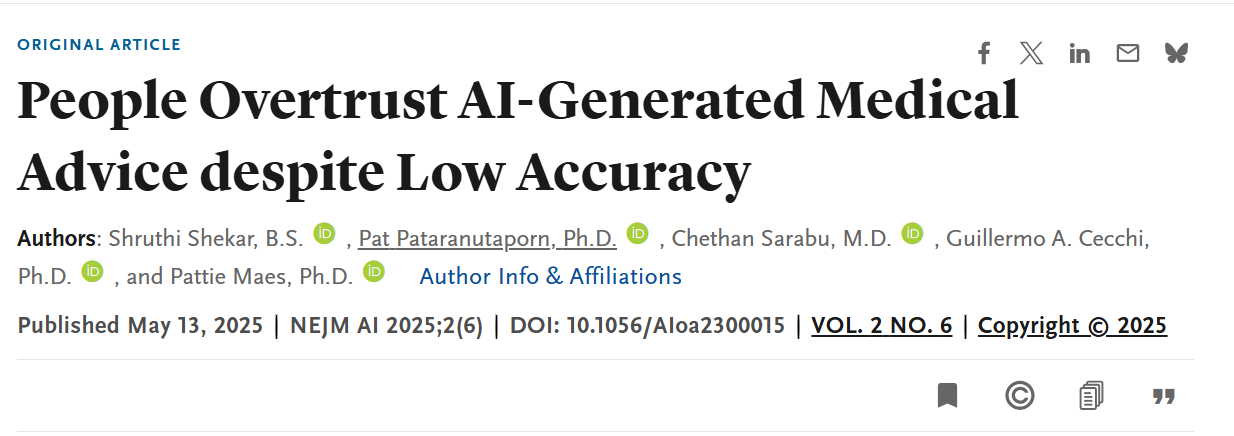 Emsley, R. (2023). ChatGPT: These are not hallucinations - they’re fabrications and falsifications. Schizophrenia, 9(1), 52. Lautrup, A. D., Hyrup, T., Schneider-Kamp, A., Dahl, M., Lindholt, J. S., & Schneider-Kamp, P. (2023). Heart-to-heart with ChatGPT: the impact of patients consulting AI for cardiovascular health advice. Open Heart, 10(2). Shekar, S., Pataranutaporn, P., Sarabu, C., Cecchi, G. A., & Maes, P. (2025). People Overtrust AI-Generated Medical Advice despite Low Accuracy. NEJM AI, 2(6), AIoa2300015.